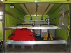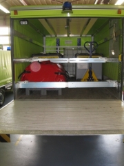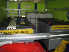 | zusätzliche Ausrüstung: | Fixe Beladung: 2x IBC 1'000L Ex-geschützt, mobile Dekostelle 4x3m aufblasbar, Palette Zubehör Dekostelle, Palette mit Chemieschutzausrüstung gross, Palette mit Chemiewehrmaterial (Neutralisationsmittel, Spezialbinder etc.) | ||
